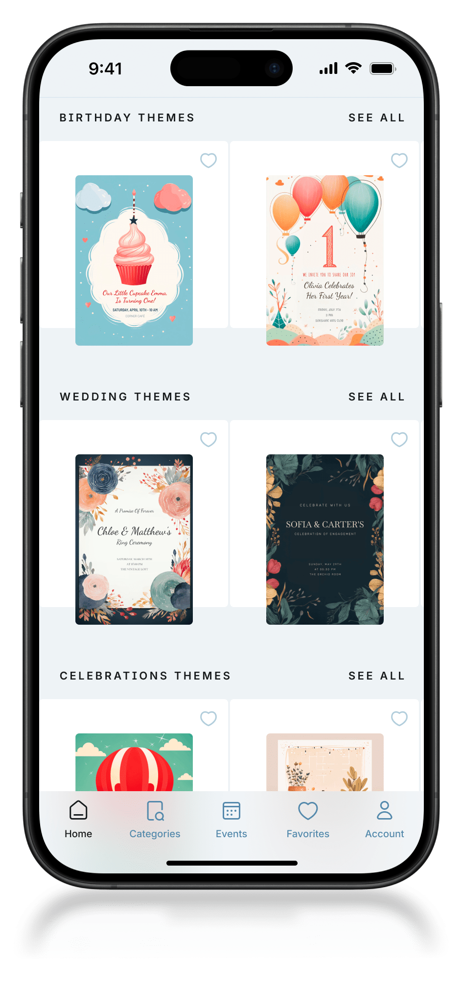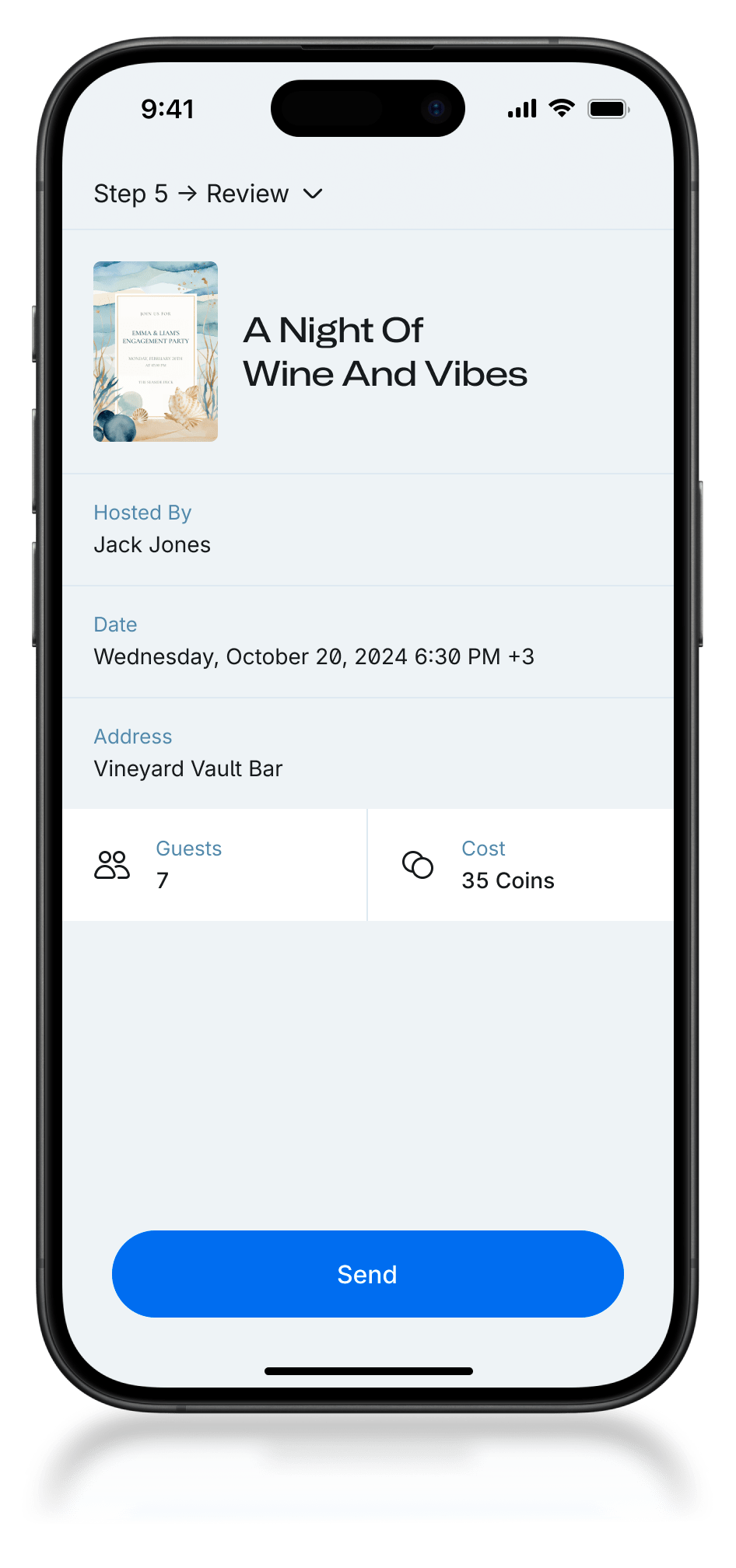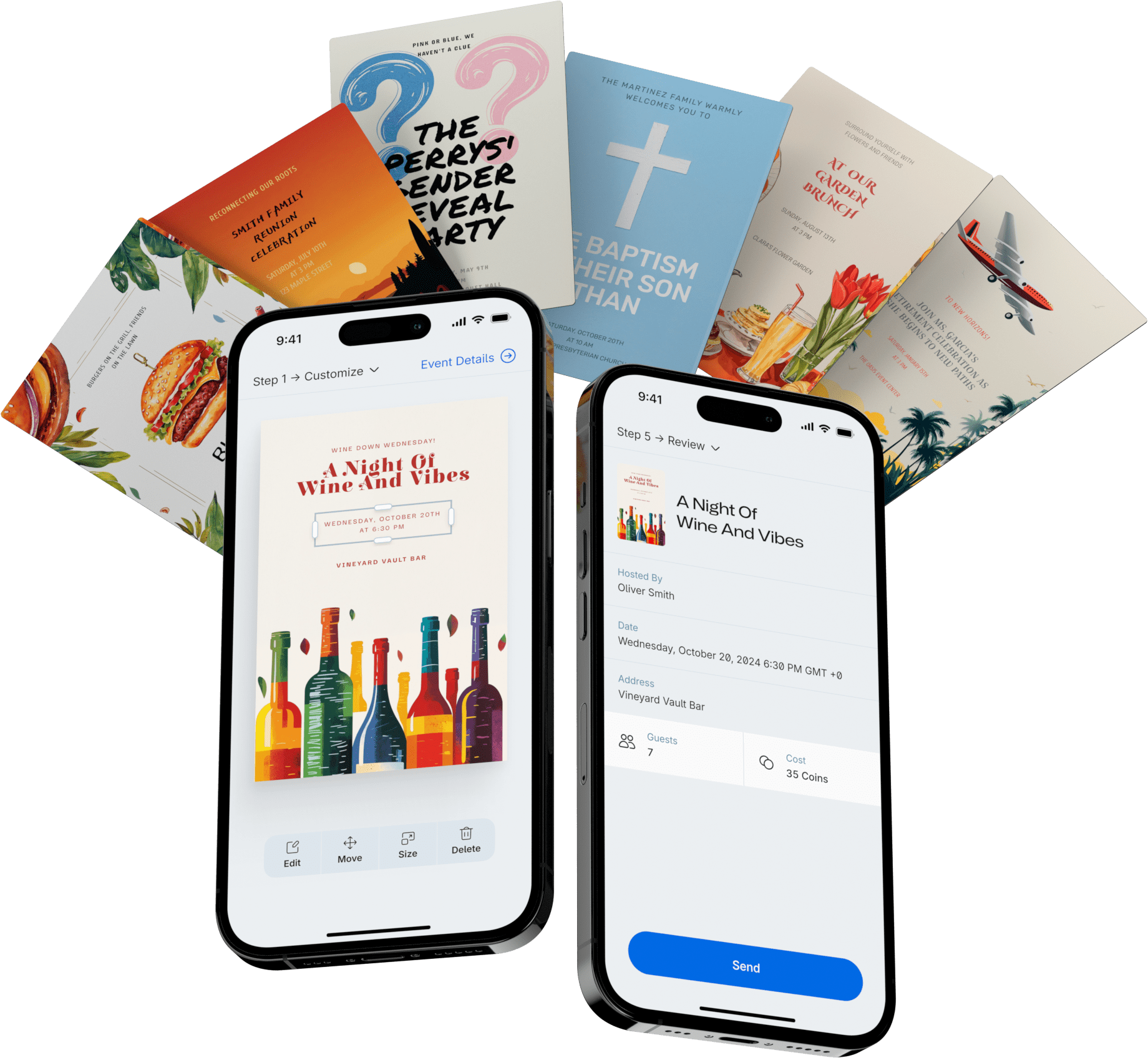 Invitations can be shared through email directly from the app. Choose your design, customize to perfection, and dispatch with a single tap using your coins.