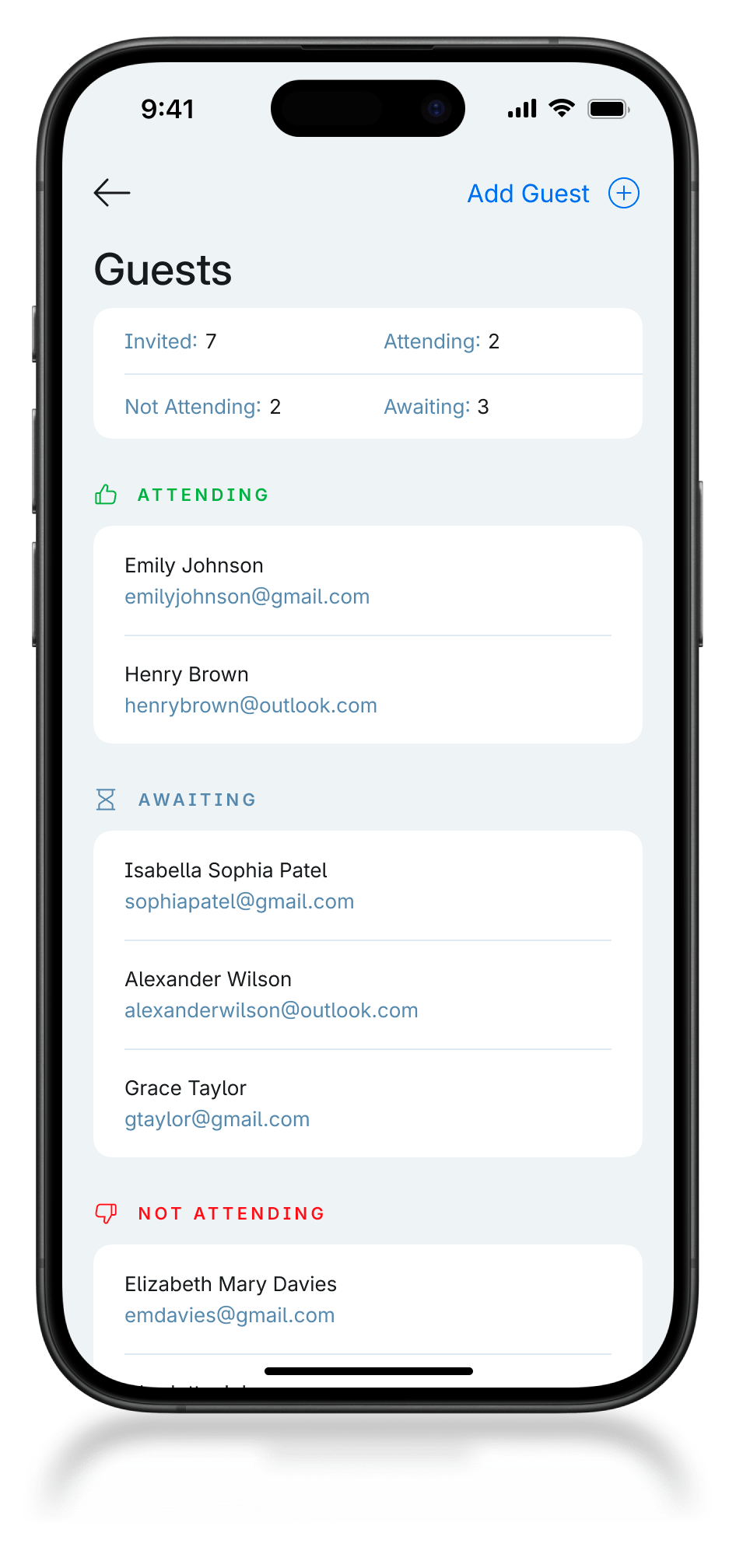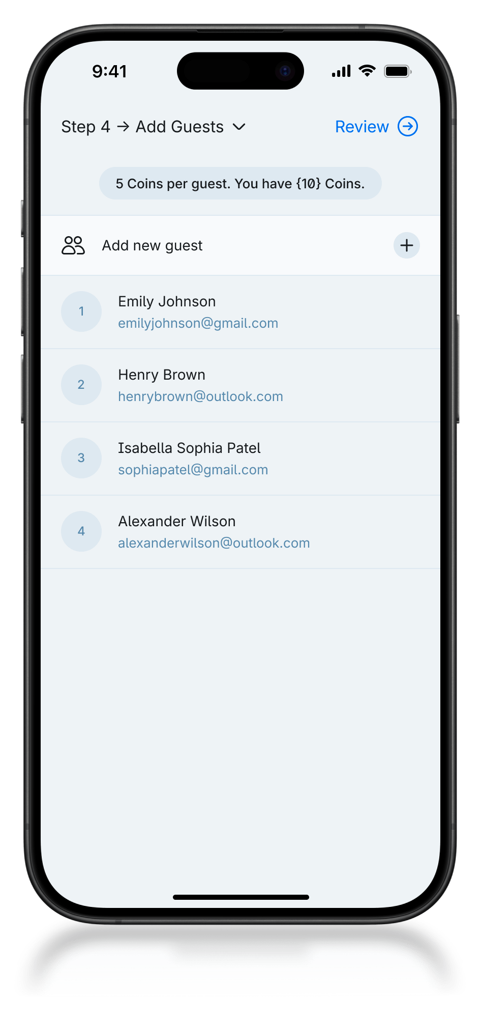 After customizing your invitation with all the event details, select 'add guests' in the next step. Enter the email addresses of your guests and click 'Save' after adding each one. Once you've added everyone you wish to invite, you're ready to review and send your invitation.